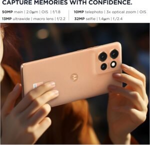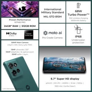- Moto ai Pro Grade camera: Capture life in motion with next-level photos and videos, powered by moto ai. The AI powered Smart Stabilization allows for incredibly smooth-looking video that adjusts to significant shakes, motion, or vibrations, even when video is being captured in the middle of the action.