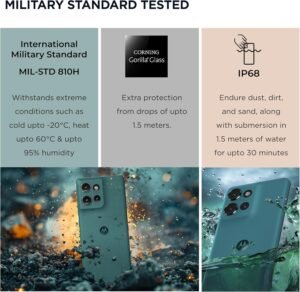 - Military Standard Strength: Tested against International Military Standards (MIL 810) for durability and extreme environmental conditions. Withstands temperatures as cold as -20°C, heat upto 60°C & 95% air humidity. IP68 & Corning Gorilla Glass provide addition protection.